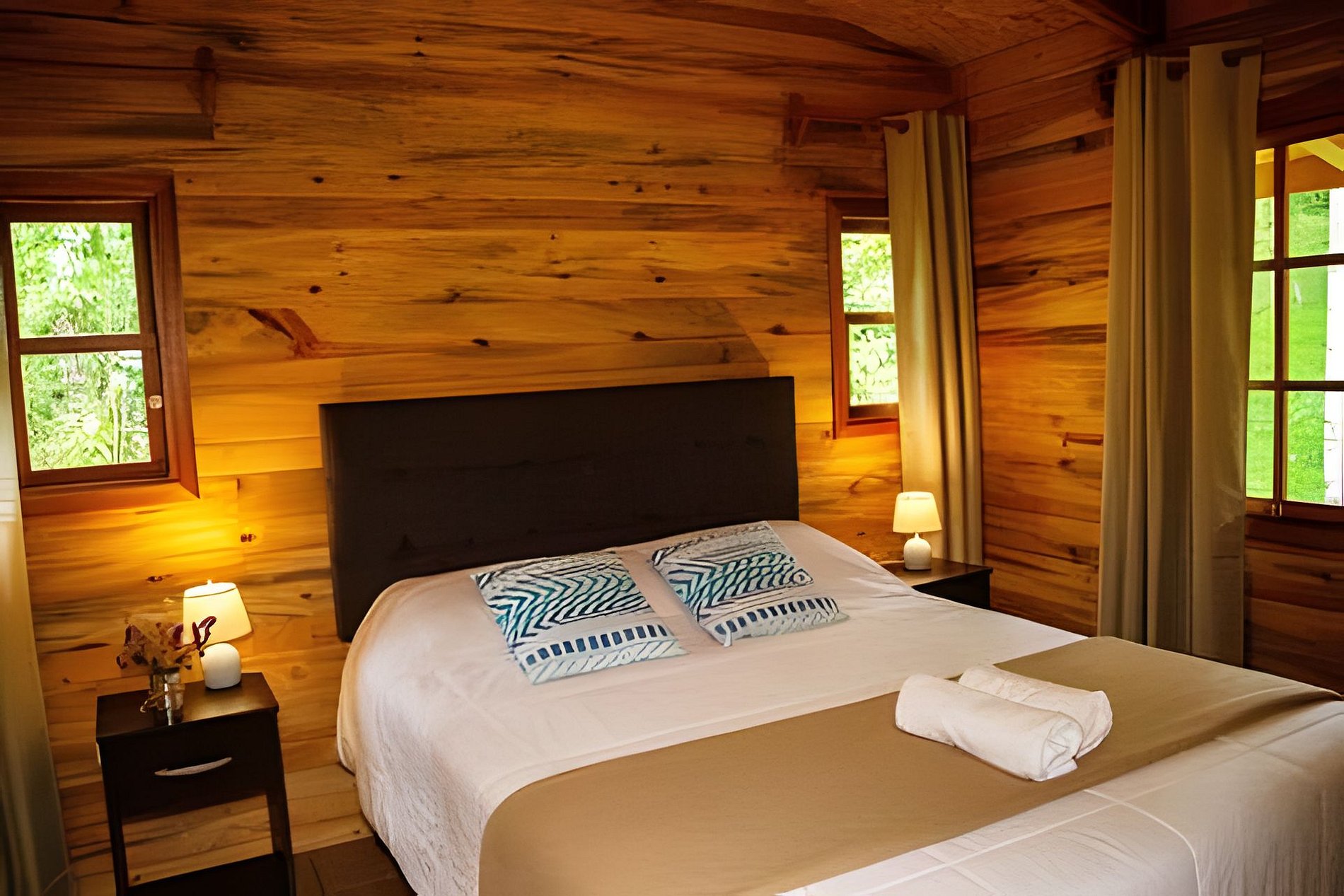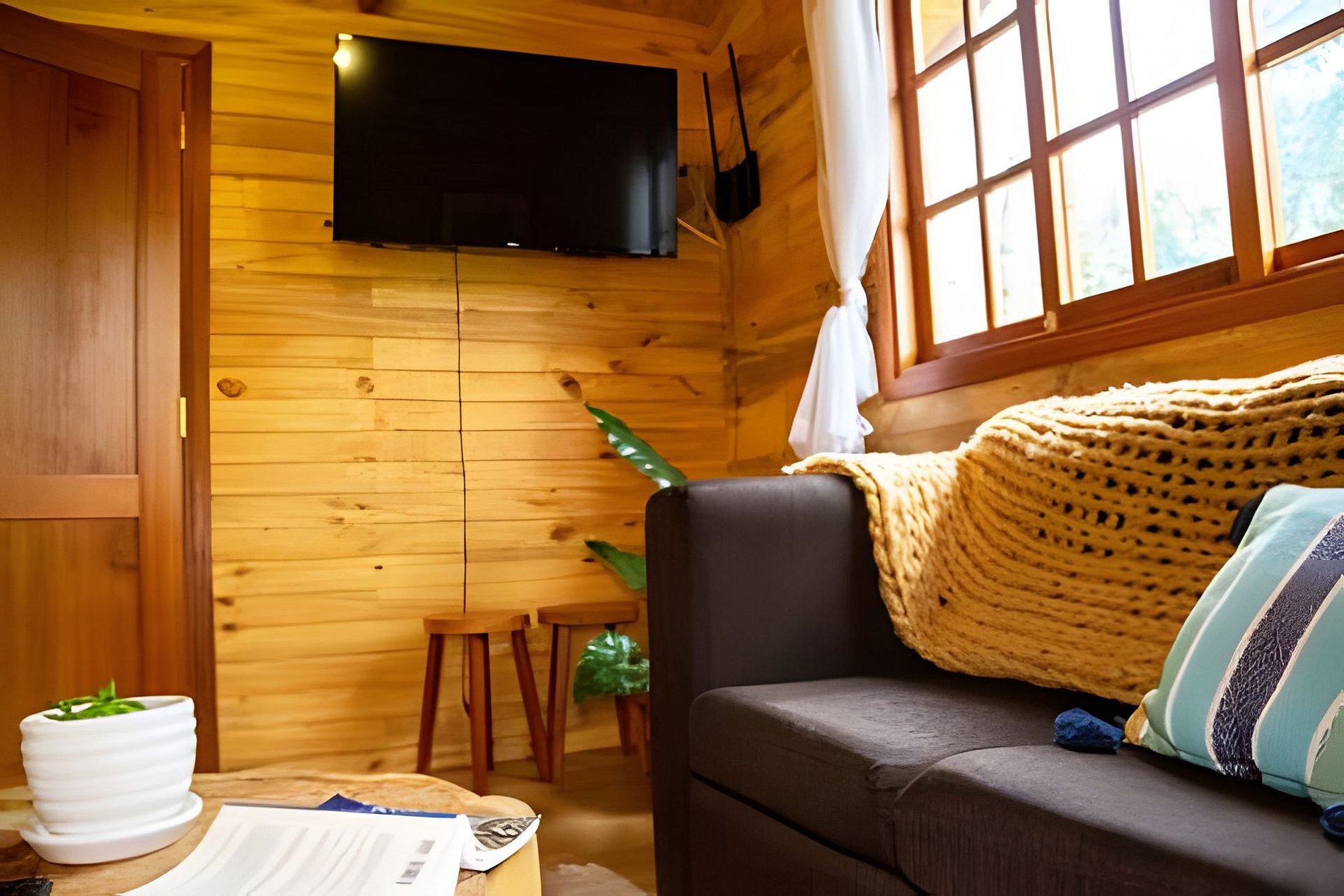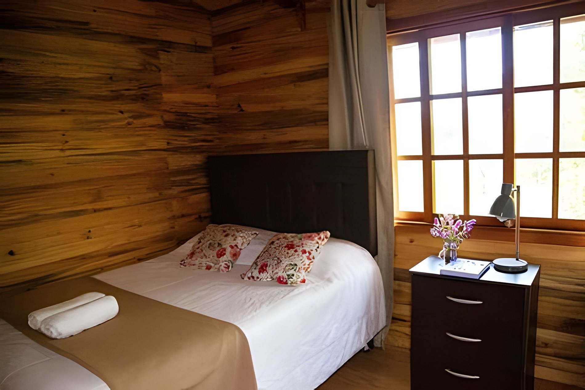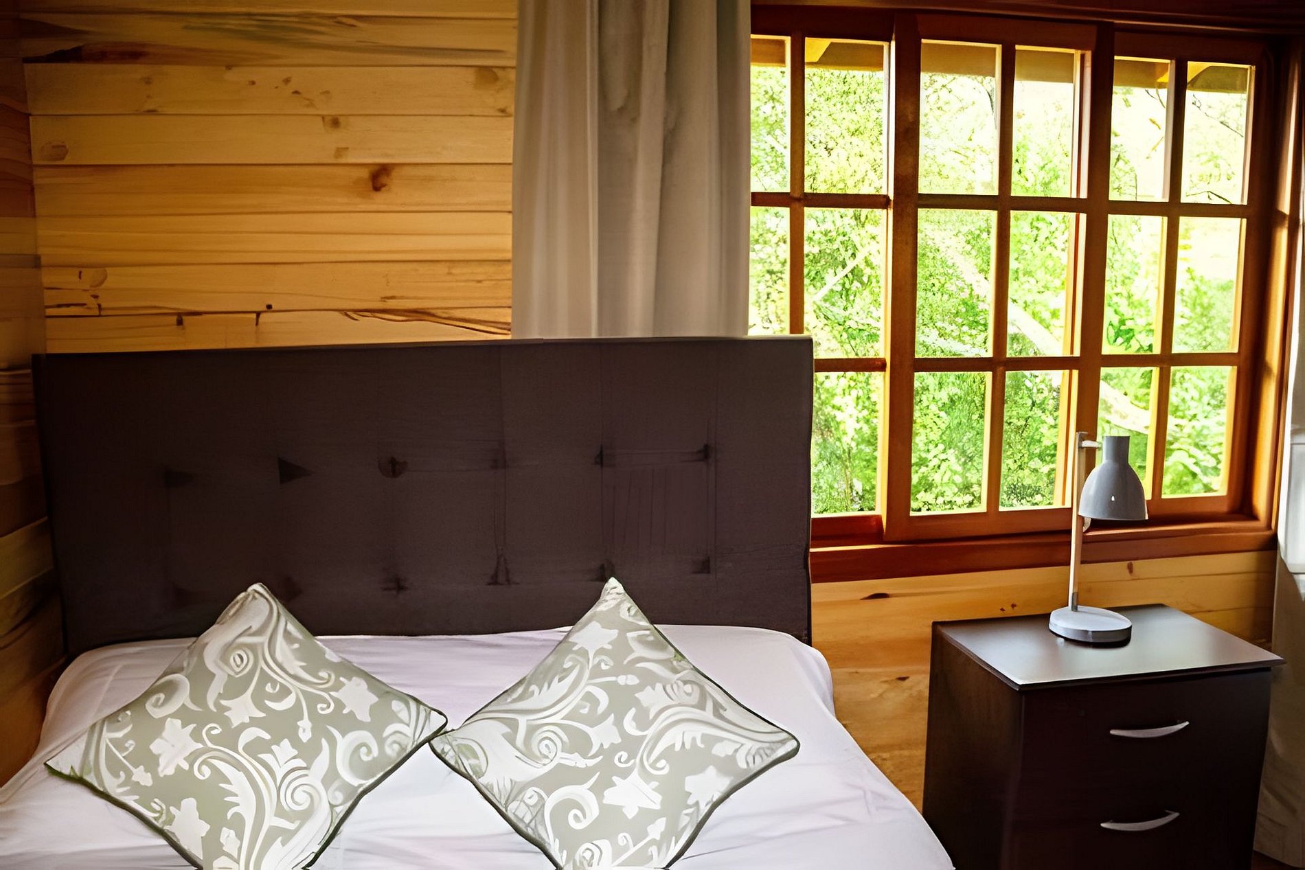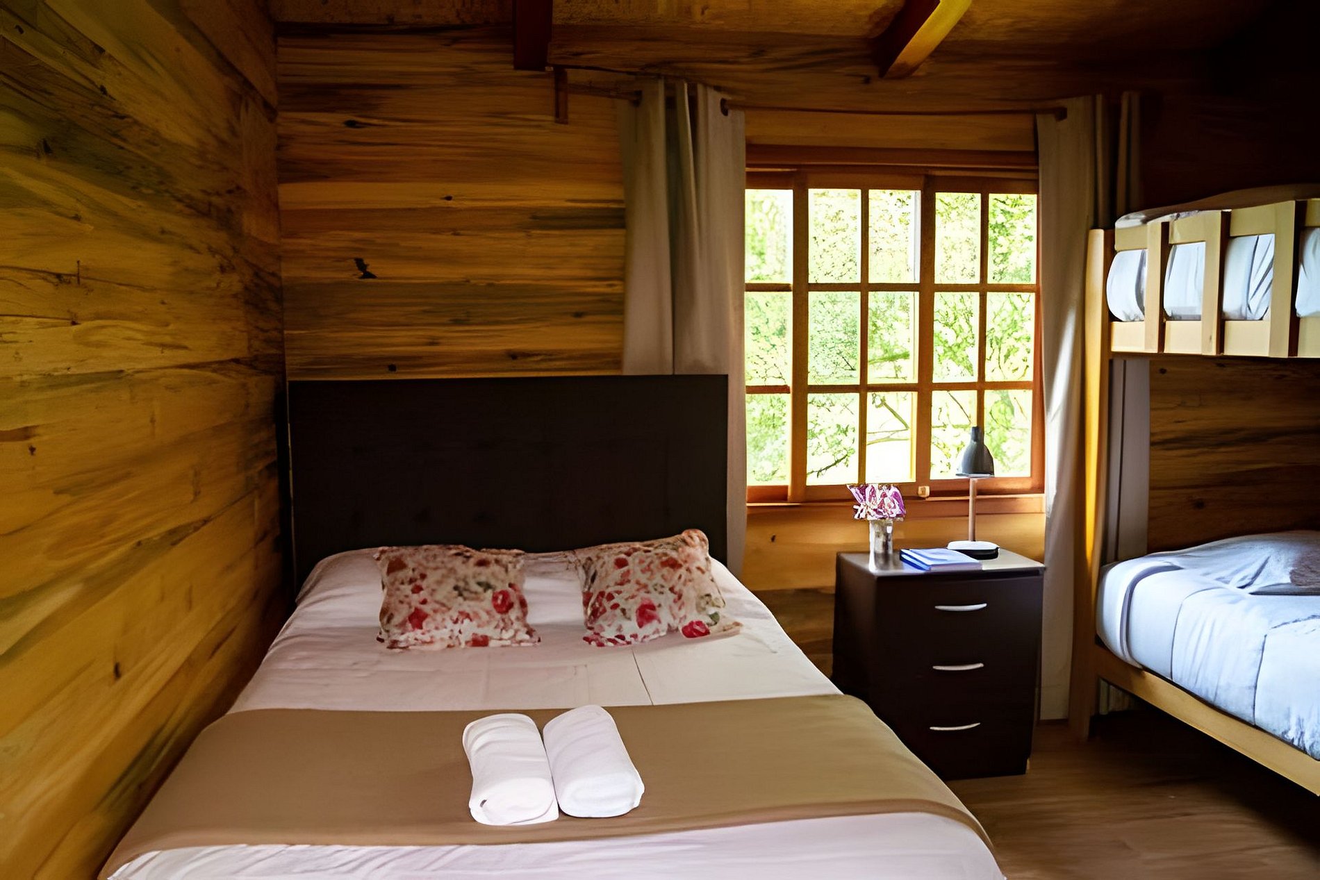 Te hospedarás en una cabaña con tres habitaciones y dos baños, cocina completa, sala de Tv y comedor con vista panorámica
